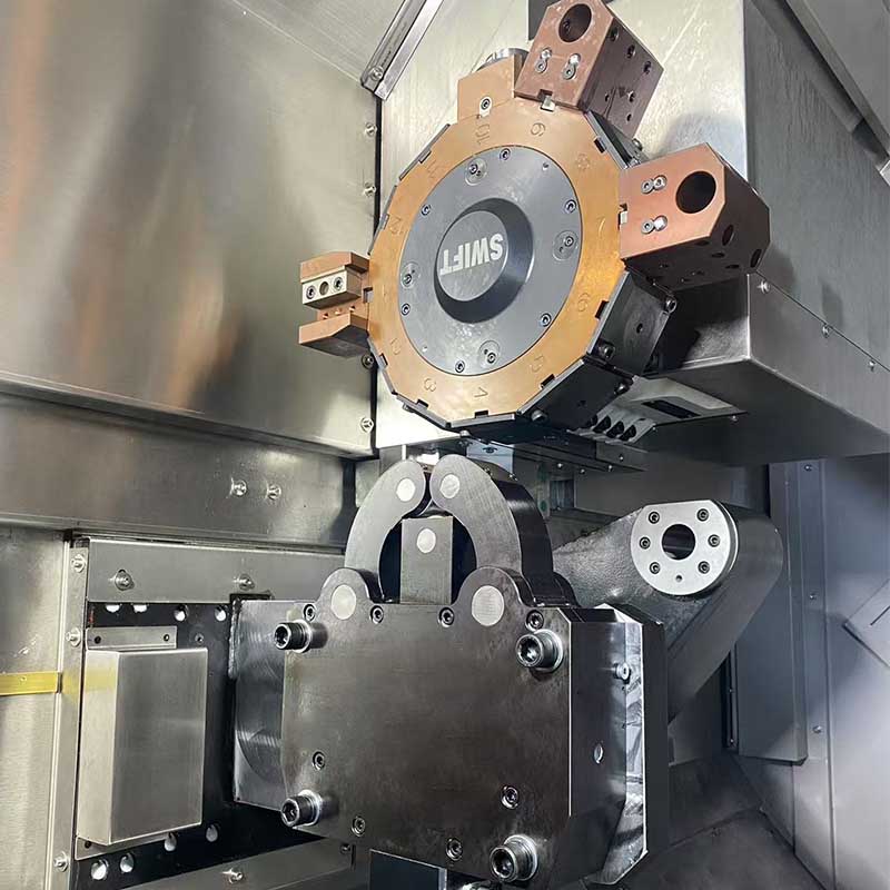 - Slant-bed CNC lathe uses a beveled overall bed for more stable force during cutting.