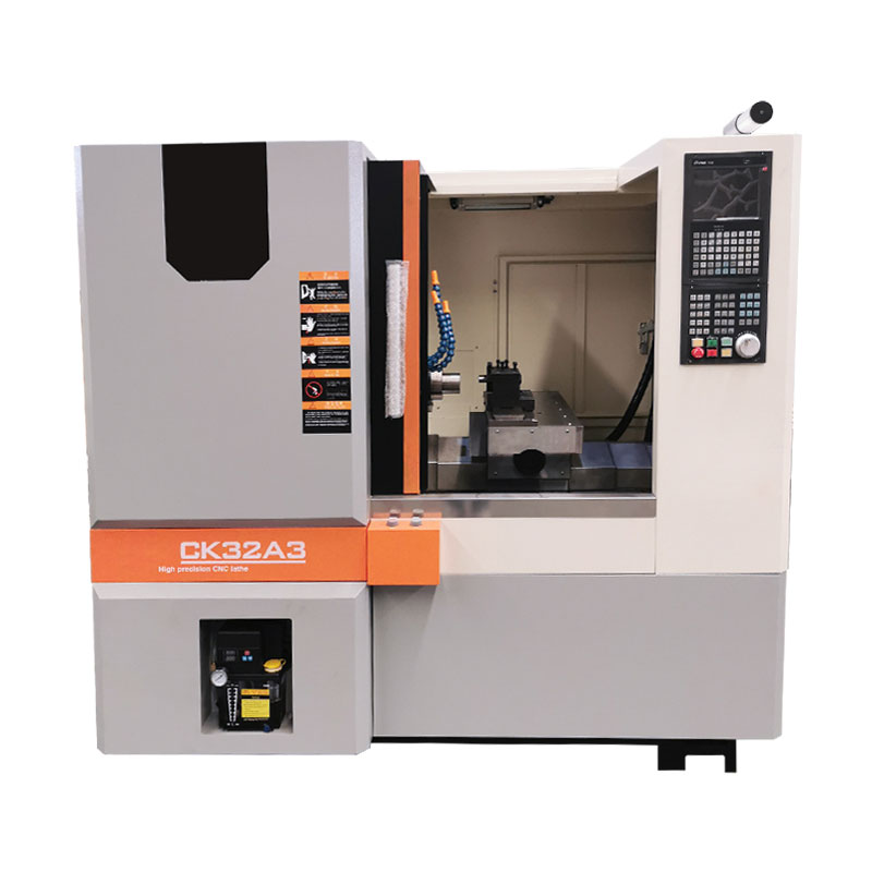 CK32A3 multifunctional turning and milling CNC machine tool, on the basis of which can be based on the different production requirements of the parts. Choose to configure into turning and milling composite lathe and double spindle CNC row knife lathe, the structure of the form is to add a Y-axis and side milling power cutter head or end face power head on the drag plate, which can meet the needs of turning and milling composite processing. Another can add a sub-spindle on the small drag plate, and fix a Y-axis, sub-spindle tool holder and cut-off tool holder on the side of the machine tool spindle box, which can realise the automatic exchange of work processes and the processing of the second process, and can realise the full-automatic machining with the automatic feeder. It not only maintains the features of good rigidity and high cutting precision of the row of knives lathe, but also solves the problem of two process machining under one clamping of the workpiece.