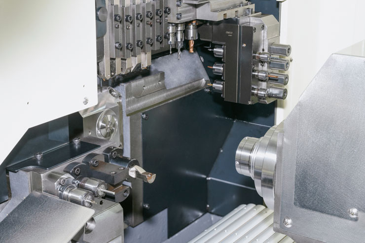 The gang tools adopts stepped guide rail structure, to improve the rigidity of the tool holder table, smooth chip removal. It’s equipped with side poer tools and spindle indexing function, which can meet the needs of complex turning, milling and drilling compound machining. As to guide bushing structure, can select fixed guide bushing cutting. Non-guide bushing cutting and full range rotary guide bushing cutting, meets multi processing requirements.