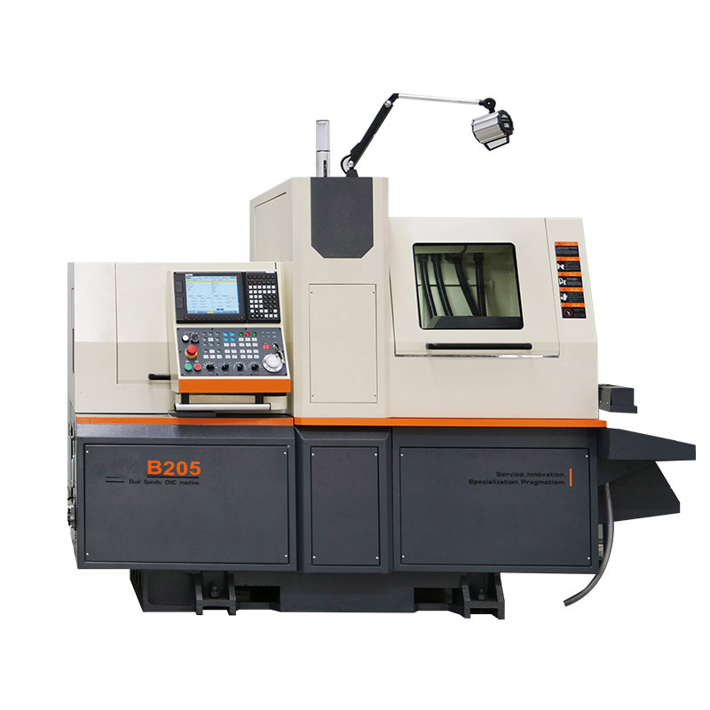 B205 swiss type cnc lathe CNC system adopts four axis four linkage, high stability, high precision, easily operate. If process need, the slide live tools can be selected to drill and mill. Swiss type cnc lathe with structual design stability, high quality cast iron bed and strong rigidity. Configurated with feeder, realize automatic continuous processing.