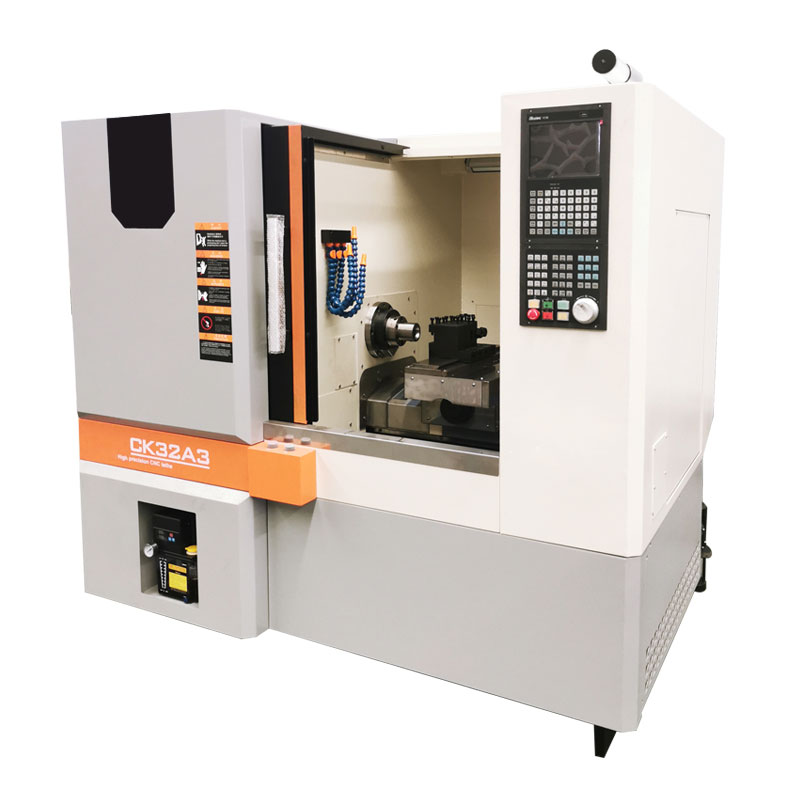CK32A3 multifunctional turning and milling CNC machine tool, on the basis of which can be based on the different production requirements of the parts. Choose to configure into turning and milling composite lathe and double spindle CNC row knife lathe, the structure of the form is to add a Y-axis and side milling power cutter head or end face power head on the drag plate, which can meet the needs of turning and milling composite processing. Another can add a sub-spindle on the small drag plate, and fix a Y-axis, sub-spindle tool holder and cut-off tool holder on the side of the machine tool spindle box, which can realise the automatic exchange of work processes and the processing of the second process, and can realise the full-automatic machining with the automatic feeder. It not only maintains the features of good rigidity and high cutting precision of the row of knives lathe, but also solves the problem of two process machining under one clamping of the workpiece.